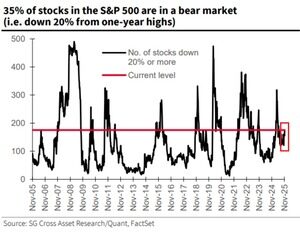 For øyeblikket er ~35 %, eller ~175, av S&P 500s komponenter i bjørnemarked, det høyeste siden mai.