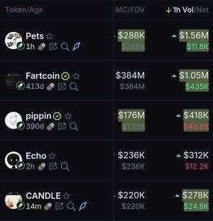 Topp Pumpfun-mynter for den siste 1 timen basert på volum: $Pets $Fartcoin $Pippin $Echo $Candle 🤖: